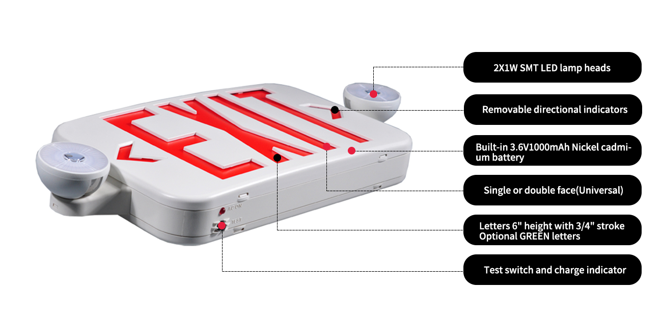 Wydajna i bezpieczna kombinacja znaku wyjściowego / Awaryjnego Lekki. Zaoszczędź pieniądze na zakup tego produktu 2 w 1. Długotrwała, niska konserwacja baterii NI-CAD. Działa na 120 - 277 VAC Universal Woltaż. Płytka czołowa zawiera strzałki lewej/prawej. Oprawa jest 1 lub 2 -stronna. Produkt jest wymieniony na liście UL i spełnia kody awaryjne NFPA 101, OSHA i UL 924. Jako dom, komercyjne i przemysłowe oświetlenie, idealne na korytarz, korytarz, szpital, mieszkania, kościoły, centra handlowe, supermarkety, szkoły, hotel, pub, restauracja, magazyny, budynek biurowy itp.
