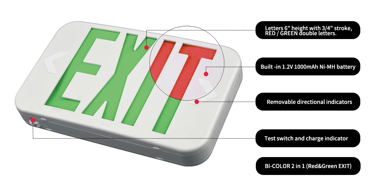 Prosty, wydajny i bezpieczny znak wyjściowy na liście UL z czerwonymi lub zielonymi literami LED. Oszczędzaj pieniądze na kupowanie tego produktu 2 w 1. Długotrwały, niski bateria NI-CAD. Działa na 120 lub 277 VAC.