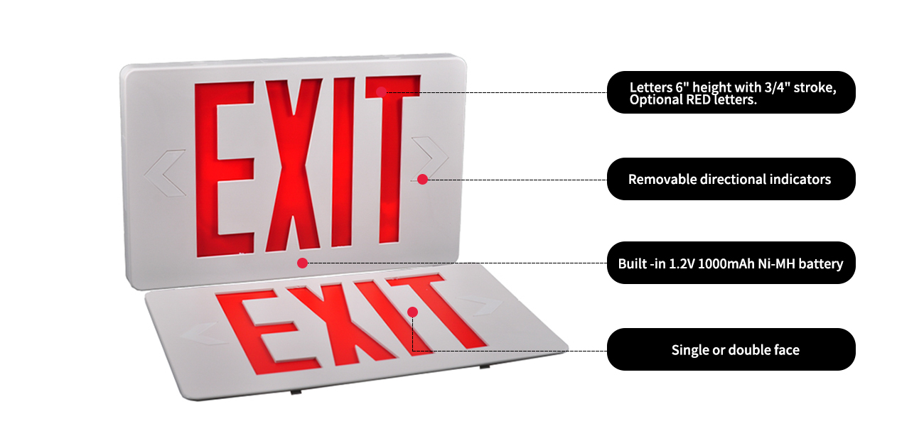 *Konstrukcja - Znak wyjściowy LED jest konstruowany z formowanego wtrysku, opóźniającego płomienia V -0, obudowy termoplastycznej o wysokim uderzeniu. Biała obudowa jest standardem.